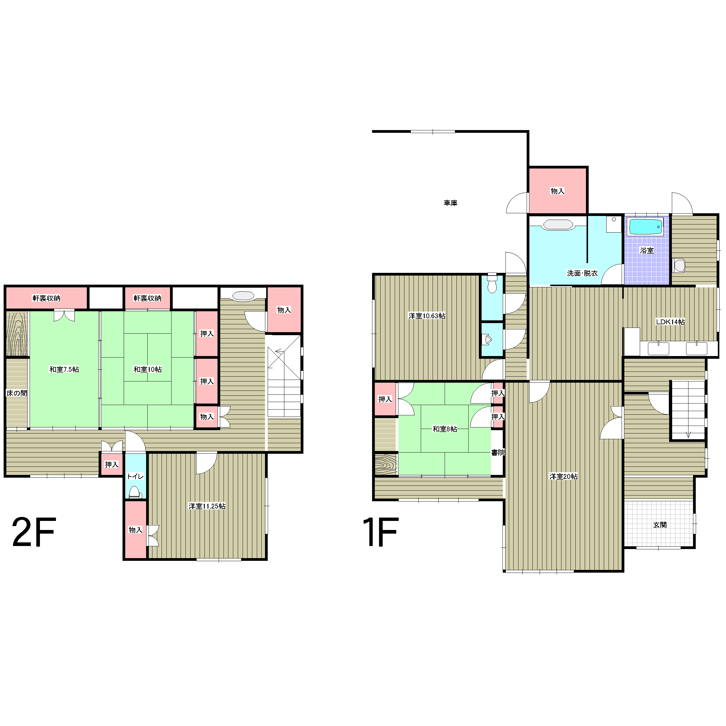 間取りは6LDKで各部屋ゆったりとした間取りでは1階2階に洗面、トイレが設けられています。